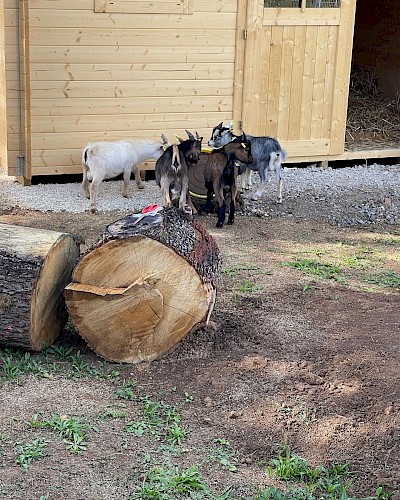 Das ist sicher, sie sind eine kleine Attraktion. Am Sonntag, dem 4. September, sind Caramel, Brownie, Şeker, Blacky und Schoki in ihr Gehege im Gemeinschaftsgarten eingezogen. Schnell haben die fünf zahmen Zwergziegen-Böcklein ihr neues Zuhause, ein großzügiges Gehege mit geräumigem Stall, Baumstämmen und Felsen als Klettermöglichkeiten akzeptiert. In direkter Nachbarschaft wohnen 8 Hennen in einem großen umzäunten Auslauf mit Hühnerstall.