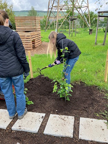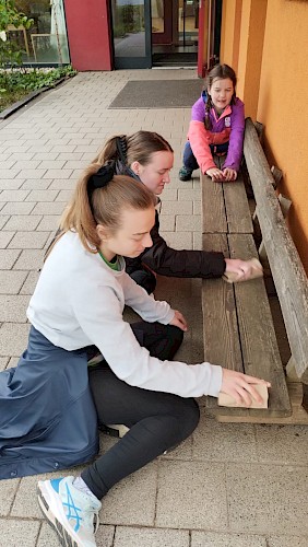 Bänke schleifen, Beerensträucher versetzen, Ziegen striegeln und Kekse backen gehörte zu den Aufgaben der Ministranten aus den Katholischen Kirchengemeinden Kernen, Remshalden und Weinstadt. Am Freitag, 19. April 2024, um 17.07 Uhr fiel der Startschuss für die Aktion im Traumpalast-Kino in Waiblingen. Alle vier Jahre ruft der BDKJ, der Bund der Deutschen Katholischen Jugend, zu der bundesweiten Aktion auf. Fünf Ministranten mit ihrem Jugendreferenten Frank Schien wurden am Freitagabend im Wilhelmine-Canz-Zentrums begrüßt und auf die nächsten drei Tage eingestimmt. Es waren am Freitag und Samstag Arbeitseinsätze im Kinder- und Familienzentrum (KiFaZ) im Haus 1 und Haus 2 geplant. Am Sonntag dann sollten die Jugendlichen im Wilhelmine-Canz-Zentrum, der Wohn- und Pflegestift der Stiftung mithelfen. Leider machte das schlechte Wetter einen Strich durch das Programm. Eigentlich sollte das Beet des KIFAZ in der Grünen Mitte für eine Bepflanzung und der Waldplatz des KIFAZ oberhalb Schnaits für die Waldtage der Kita-Gruppen vorbereitet werden. Alternativ hatten sich die Erzieherinnen Tätigkeiten, die im Trockenen ausgeführt werden können, ausgedacht. So entstand ein Insektenhotel für das Beet in der grünen Mitte und die Jugendlichen rückten lästigen Spreißeln auf den Laib. Sie schmirgelten am Freitag und Samstag die Holzmöbel der Kindergartengruppen und im Außenbereich ab. Am Samstagvormittag war es glücklicherweise etwas trockener und die Gruppe pflanzte Beerensträucher ins neu angelegte Beet des KiFaZ im Garten des Mutterhauses ein. Danach verwöhnten sie die Zwergziegen, die gestriegelt und gefüttert wurden und verlegten Platten am Zugang des Ziegengeheges, damit man nicht mehr durch den Matsch waten muss.