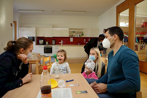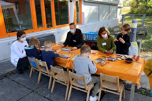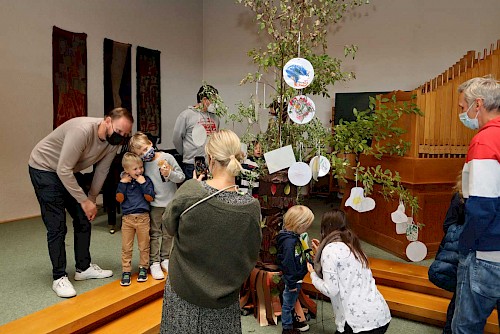 Nach dem Gottesdienst lud Dunja Hummel, Leiterin des Kinder- und Familienzentrums, große und kleine Gäste zu einem Imbiss und einem Programm mit Mitmach-Angeboten ein. Als besondere Attraktion wartete im Garten ein Streichelzoo. Possierliche Zwerghühner ließen sich zutraulich auf den Arm nehmen und streicheln. Da waren Laufenten und Puten und wer den Mut aufbrachte, konnte sogar eine echte Schlange oder eine der Echsen (Bartagamen) berühren. Kuschliger waren eindeutig die Kaninchen und die größeren Tiere wie die Schafe, Ziegen oder Alpakas, die mit einer Kuh und einem Zwergpony, denen sich Kinder und Erwachsenen in begehbaren Gehegen nähern konnten. Reger Betrieb herrschte auch am Basteltisch, an dem kleine Blumentöpfe bemalt und dann mit Erde befüllt und mit Samen versehen wurden. Am Schminktisch verwandelten sich die Kinder in Katzen oder Schmetterlinge und am Experimentiertisch konnte Jung und Alt bewundern, wie sich ein Luftballon scheinbar von selbst aufbläst. Viele der Anwesenden nutzten das Zusammensein unter der strahlend warmen Oktobersonne für Gespräche oder den Austausch von Informationen. Die Veranstaltung stieß bei den Eltern auf ein durchweg positives Echo: „Ein tolles Event. So schön, wie sich das Haus entwickelt hat, und dass wir ein Teil davon sind. Die Tiere waren das absolute Highlight.“-„Endlich nach der langen Zeit konnten wir wieder einen Tag als KiFaz-Familie in Gemeinschaft genießen, vielen Dank für den schönen Tag.“