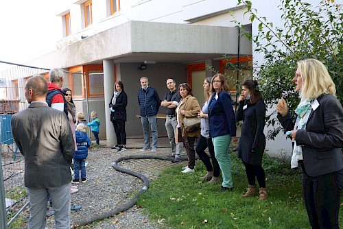 Ursula Fink, Pfarrerin in Endersbach, selbst KiFaz-Mutter und Mitglied im Lehrerkollegium der Evangelischen Fachschule für Sozialpädagogik, gestaltete zusammen mit den Kindern und Erzieherinnen die Andacht. Die Kinder sangen und schmückten einen Baum mit selbstgemalten Bilder, die ihre Lieblingsspiele und -früchte vorstellten. Ulrich Spangenberg, Leiter des Amtes für Familie, Bildung und Soziales der Stadt Weinstadt, würdigte in seiner Grußrede die Weiterentwicklung des Kinderhauses am Sonnenhang zu einem Kinder- und Familienzentrum als zeitgemäß notwendigen Schritt und auf die Bedürfnisse der Eltern ausgerichtet. Bereits Wilhelmine Canz, die Gründerin der Stiftung Großheppacher Schwesternschaft, habe damals vor über 160 Jahren das Wohl von Kindern im Auge gehabt. Diesen Auftrag setze die Stiftung weiterhin auch in unserer Zeit um, indem sie heute sowohl die Bedürfnisse der Kinder und die Situation der Familien in den Blick nehme. Ein Kinder- und Familienzentrum erfüllt neben dem Betreuungs- und Erziehungsauftrag auch die Funktion als Ansprechpartner, Begegnungs- und Vernetzungsort für Eltern.