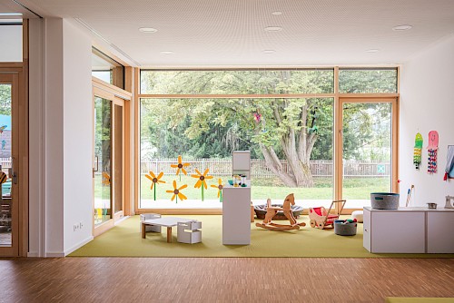 Die Räume der beiden Krippen- und Kindergartengruppen sind teiloffen gestaltet. Das bedeutet, dass neben den Gruppenräumen auch Funktionsräume zum künstlerischen Gestalten oder Werken von allen Kindern genutzt werden. Überall bieten große Fenster den Blick in den Garten.