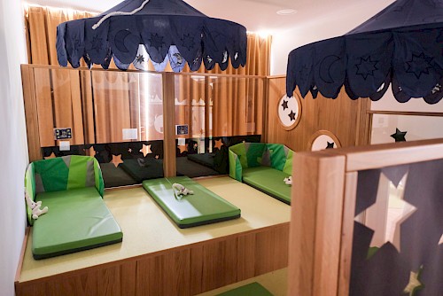 In unserem großen Bewegungsraum im Untergeschoss können Ihre Kinder toben, spielen und Sport treiben. Es gibt Ruhe- und Schlafräume und stille Ecken, in denen Ihr Kind zur Ruhe kommen kann.